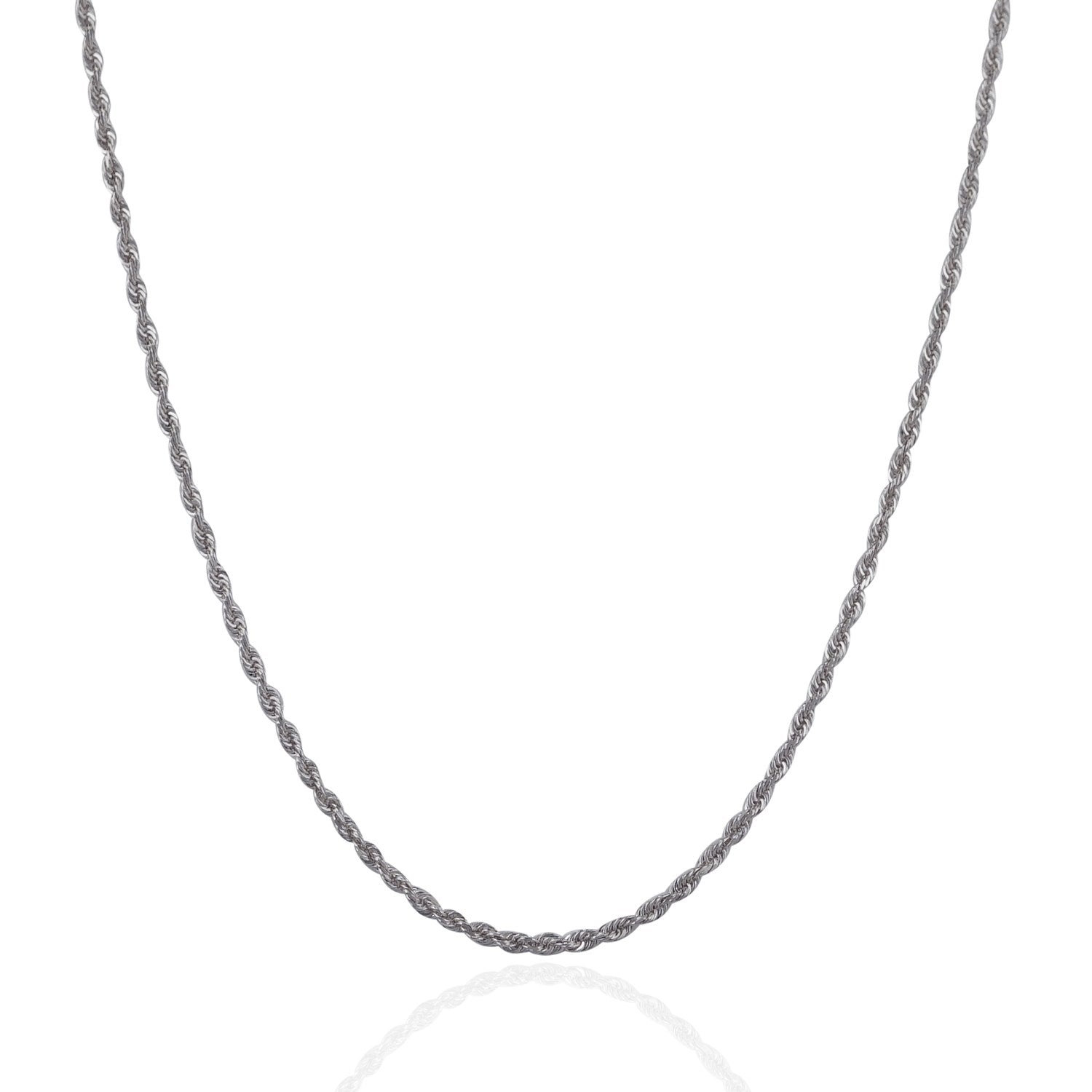 This solid diamond cut rope chain comes in 10k white gold and has a width of 1.5 millimeters.