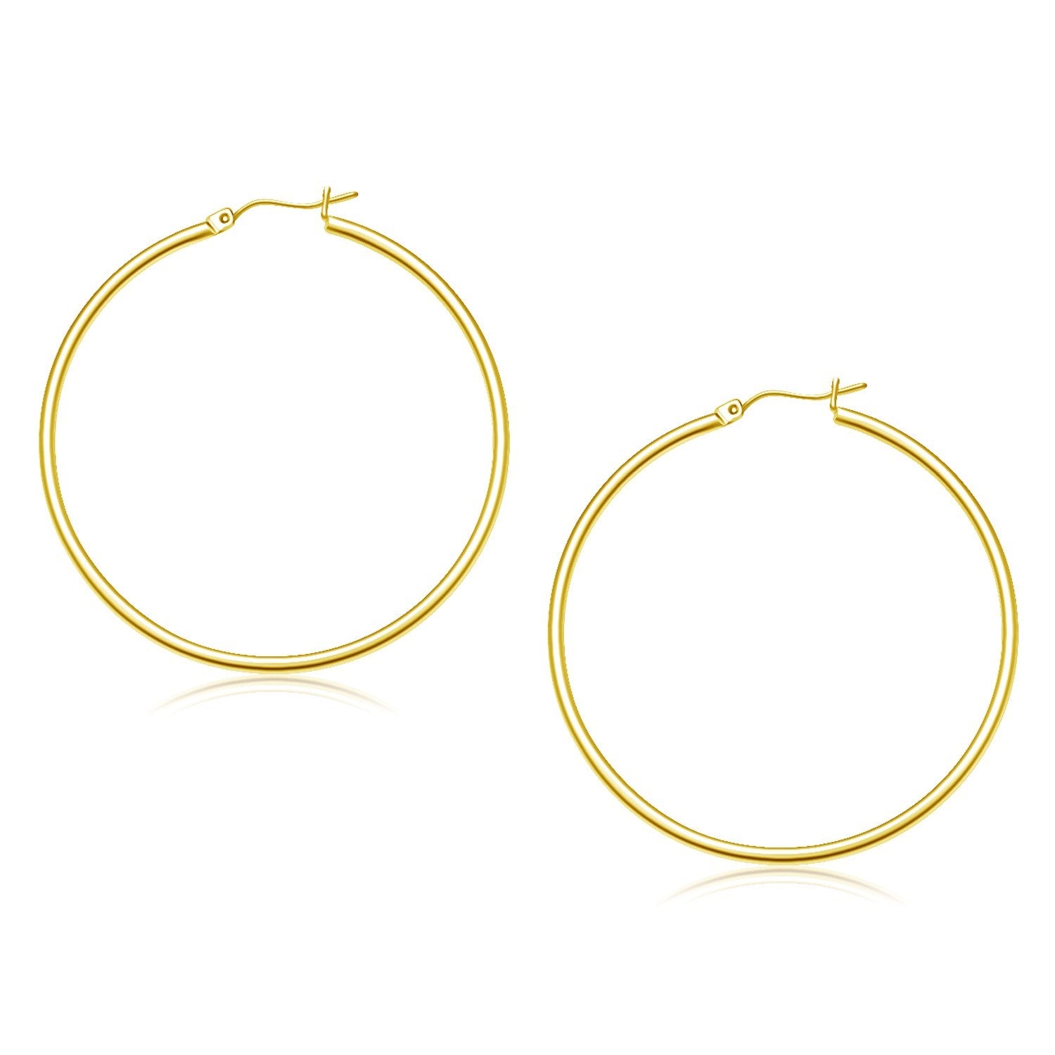 These timeless hoop earrings crafted in 10k yellow gold and measure 45 millimeters in diameter, featuring a snap lock backing.