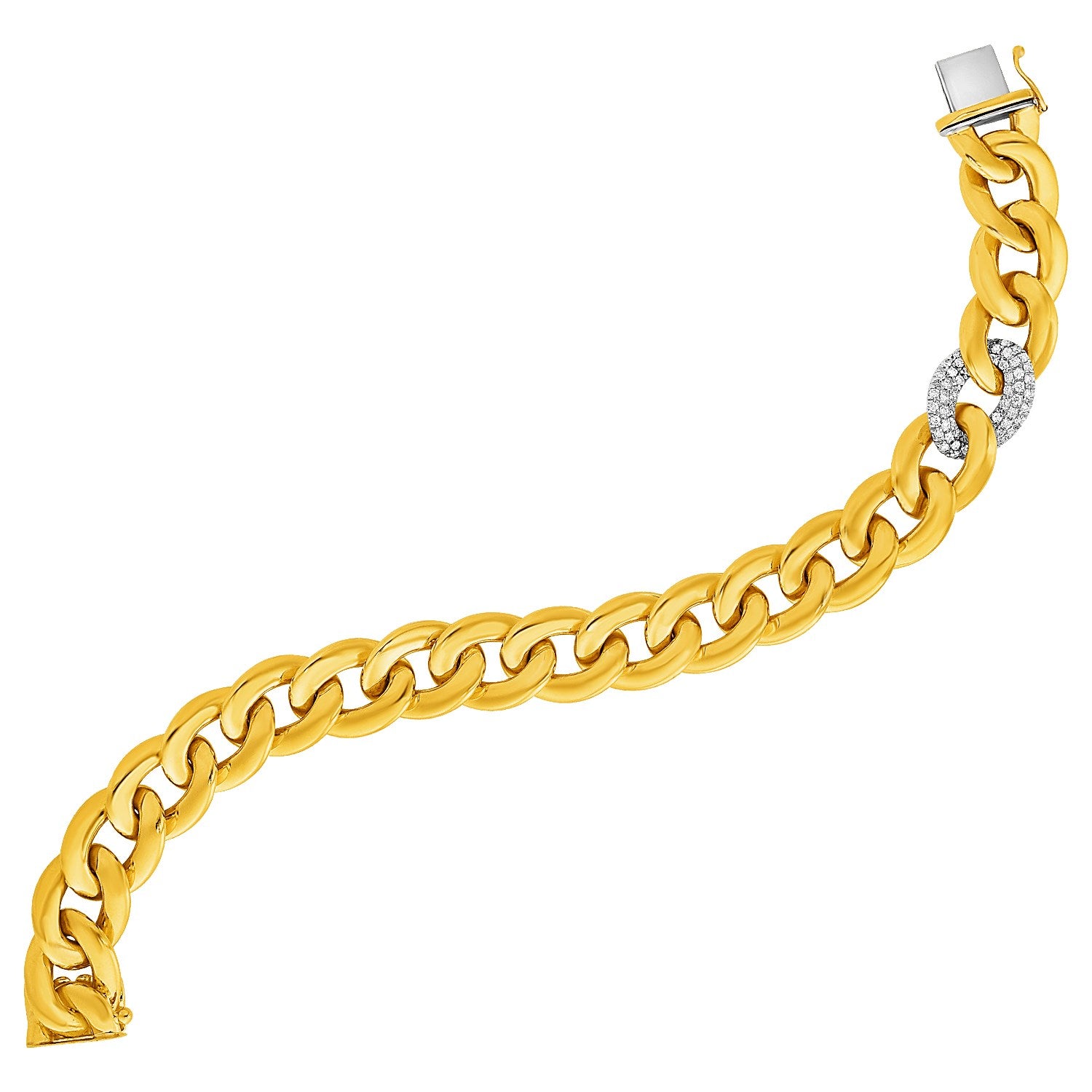 A link of diamonds gives this gold bracelet an extra bit of elegance and shine. Curb style bracelet is 7 3/4 inches long and closes with a box clasp.
