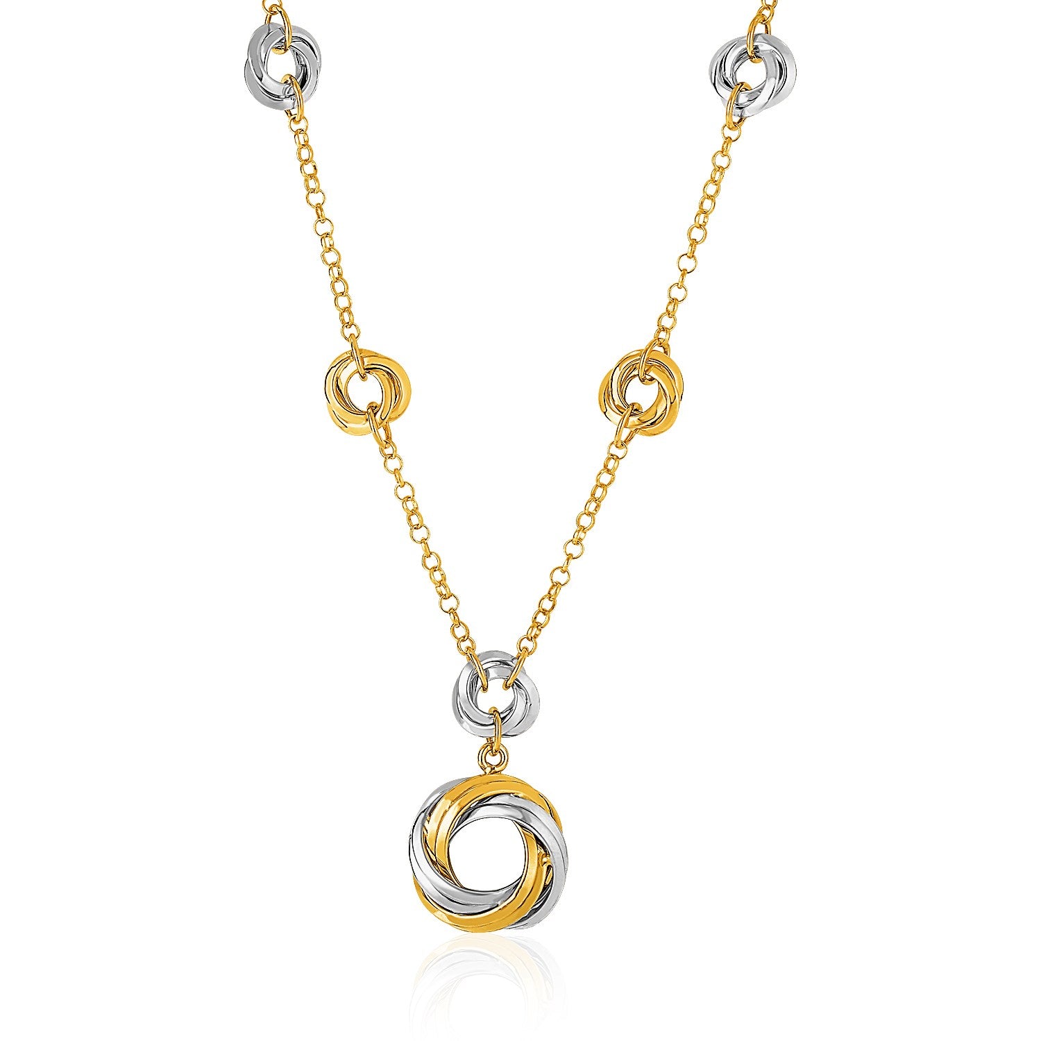 Yellow and white gold swirls dance across a simple gold chain necklace. Necklace is 17 inches long.