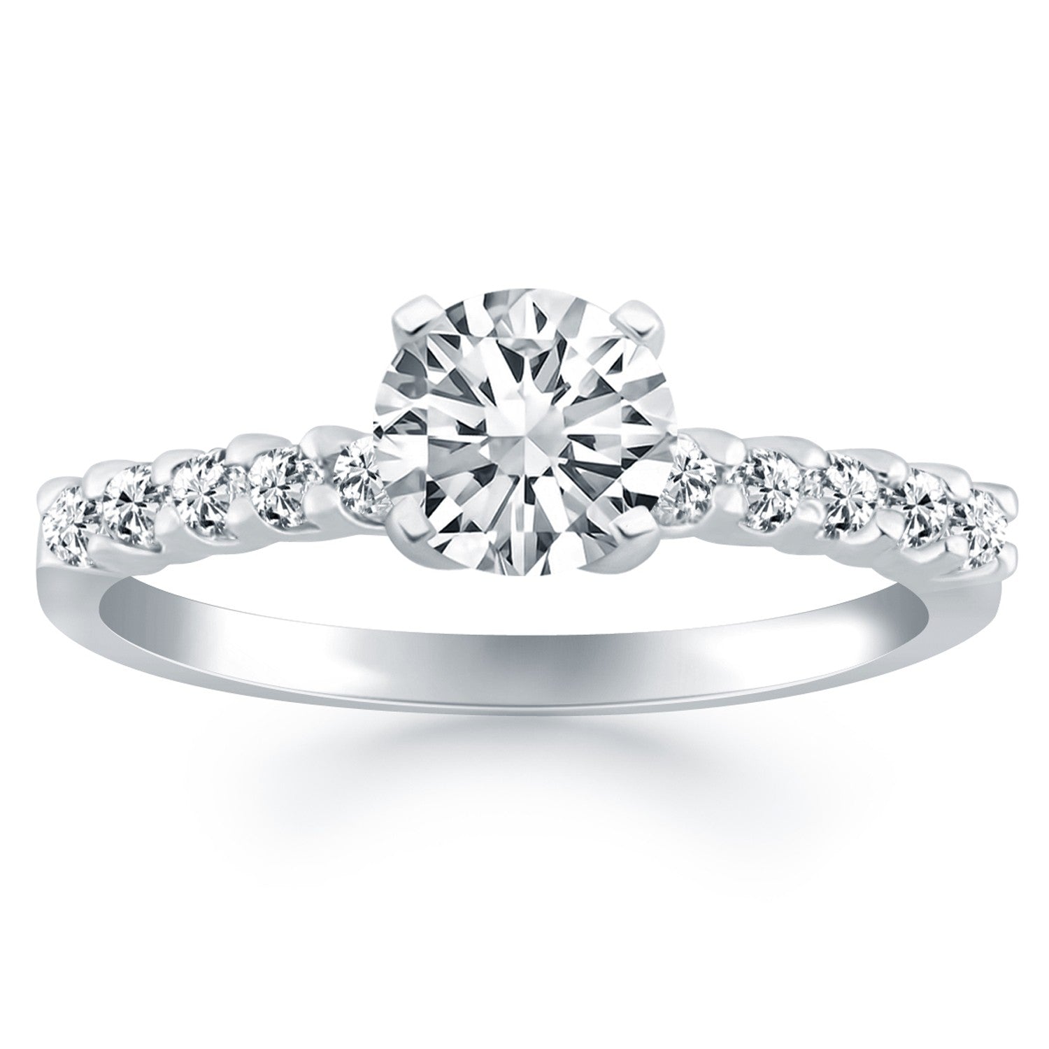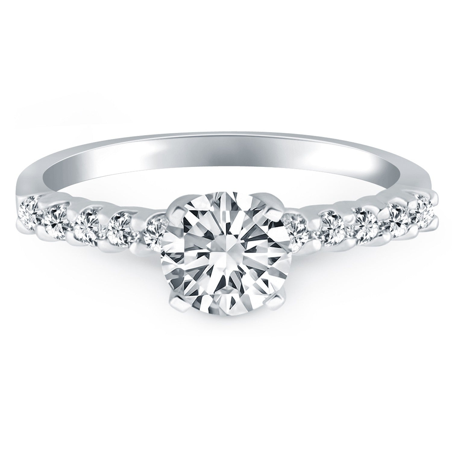 A glittering row of shared prong diamonds enlivens the band of this elegant engagement ring. The center highlights a sparkling 1/2 carat round cut diamond.