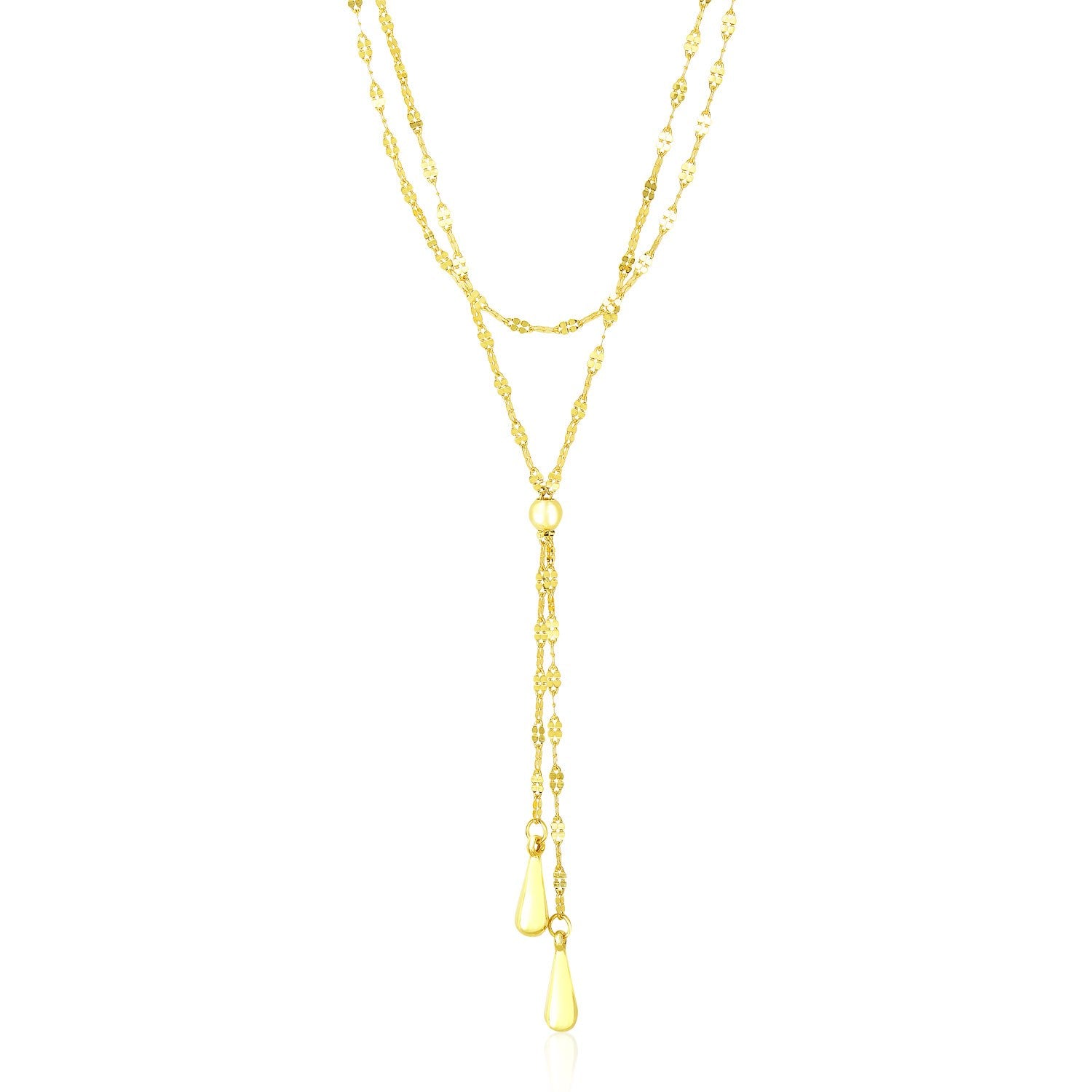 This showstopper of a double strand necklace features a chain with disc cluster sections. A lariat beauty with puffed teardrop elements, this 14k yellow gold piece comes in size 17 inches and is secured with a lobster closure.