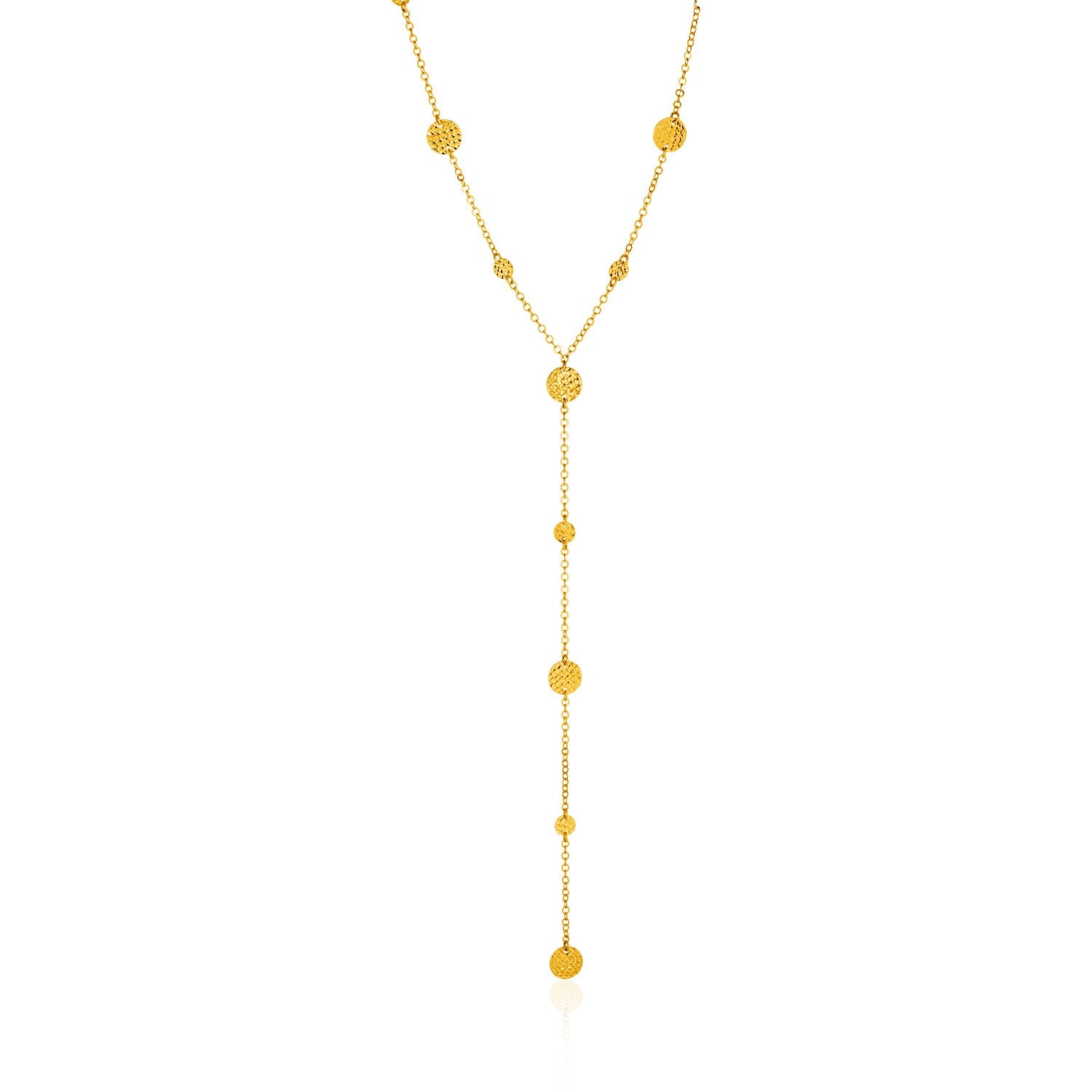 Shiny textured circles adorn this lariat necklace with a long center drop. Necklace is 17 inches long and closes with a spring ring clasp.