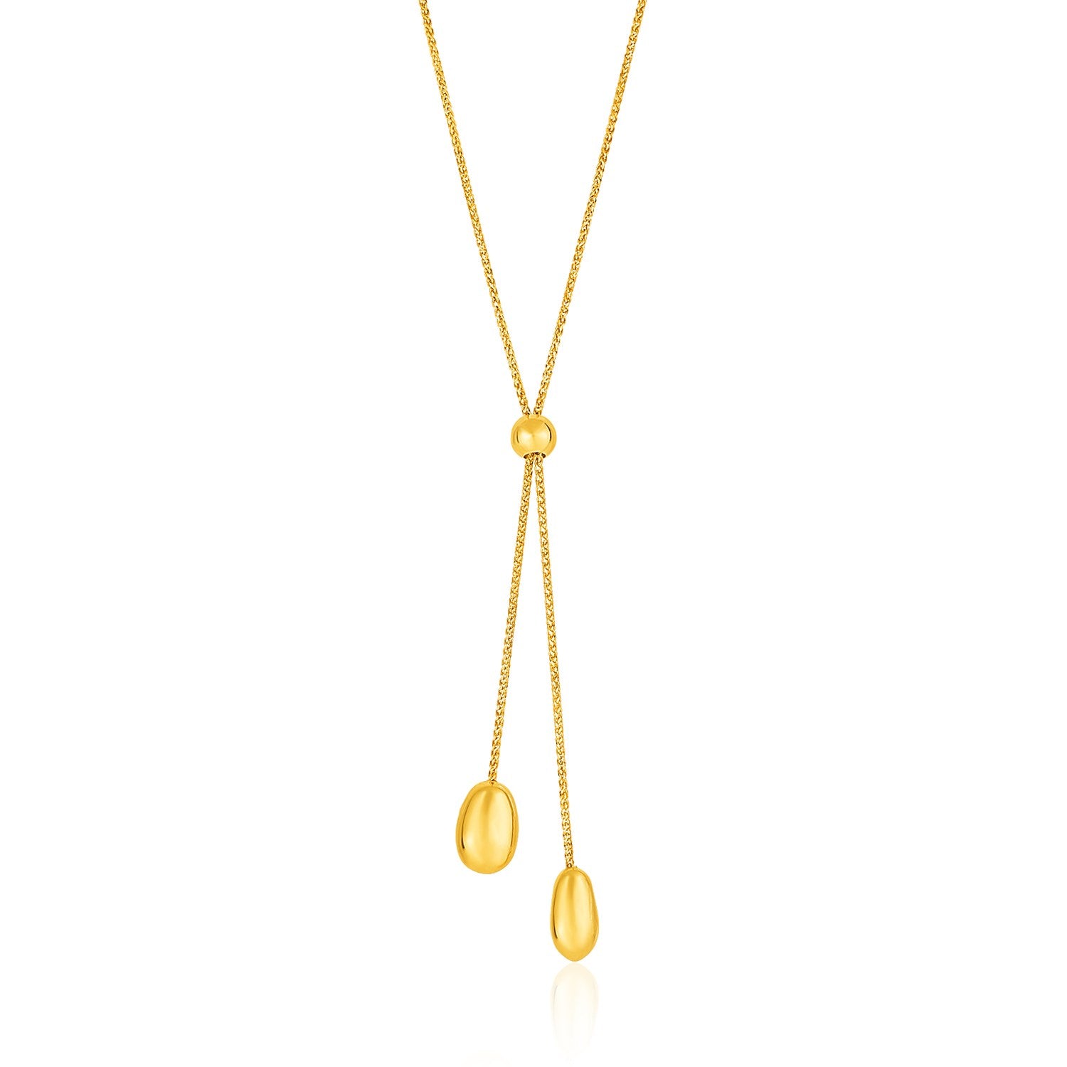 Shiny rounded gold ovals complete the delicate look of this simple necklace. Lariat necklace adjusts from the front and has no clasp.