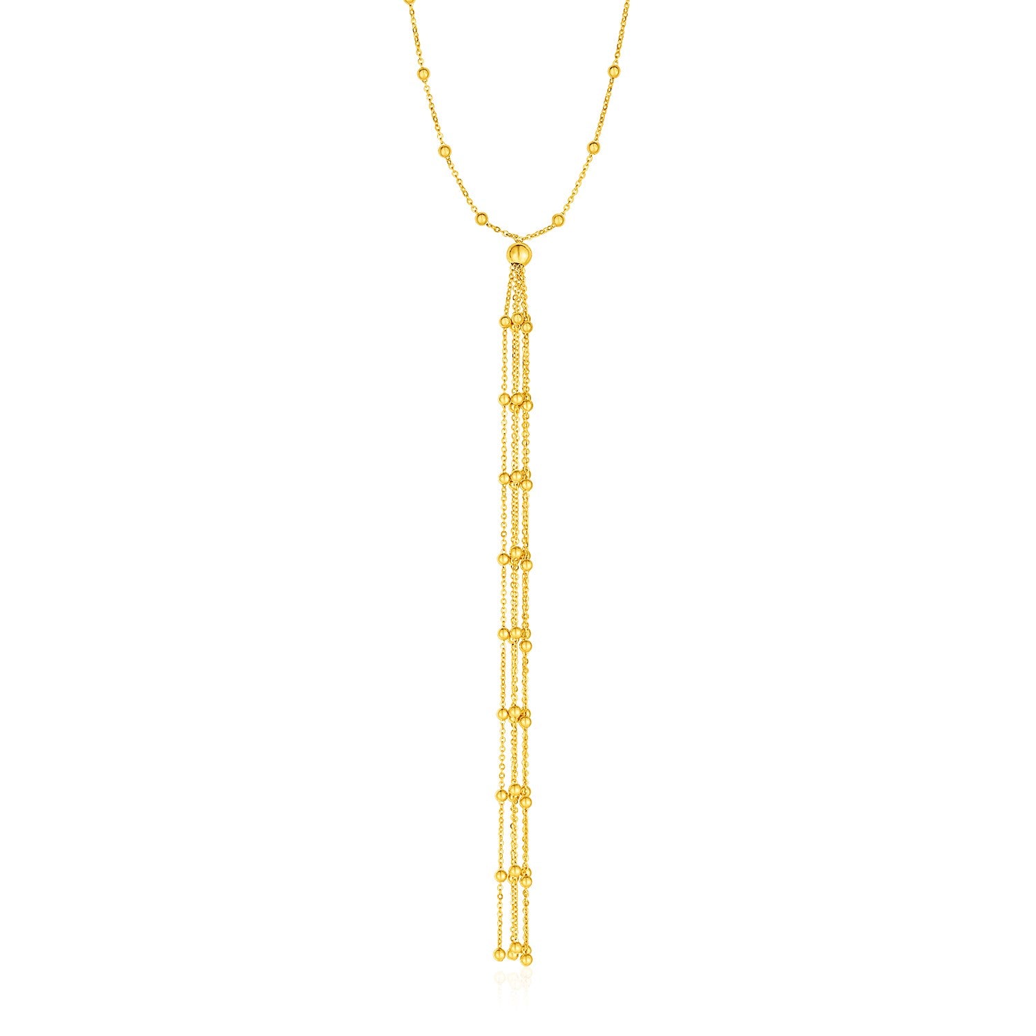 A long beaded tassel dances and plays at the center of this stunning gold necklace of chain and beads. Necklace is 17 inches long and closes with a lobster clasp.