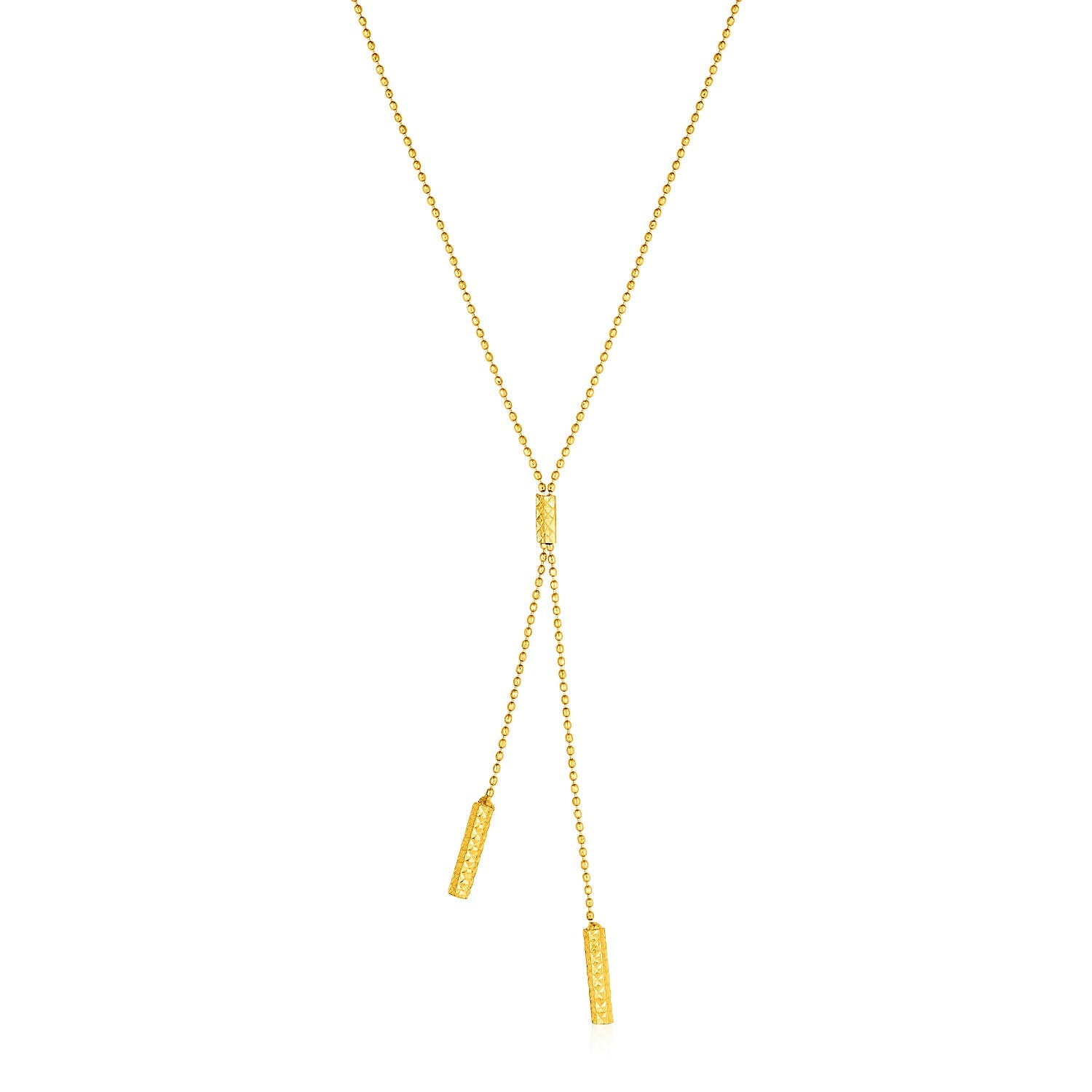Tassel-like textured bars of gold swing freely from an elegant gold lariat necklace. The necklace is 18 inches long.